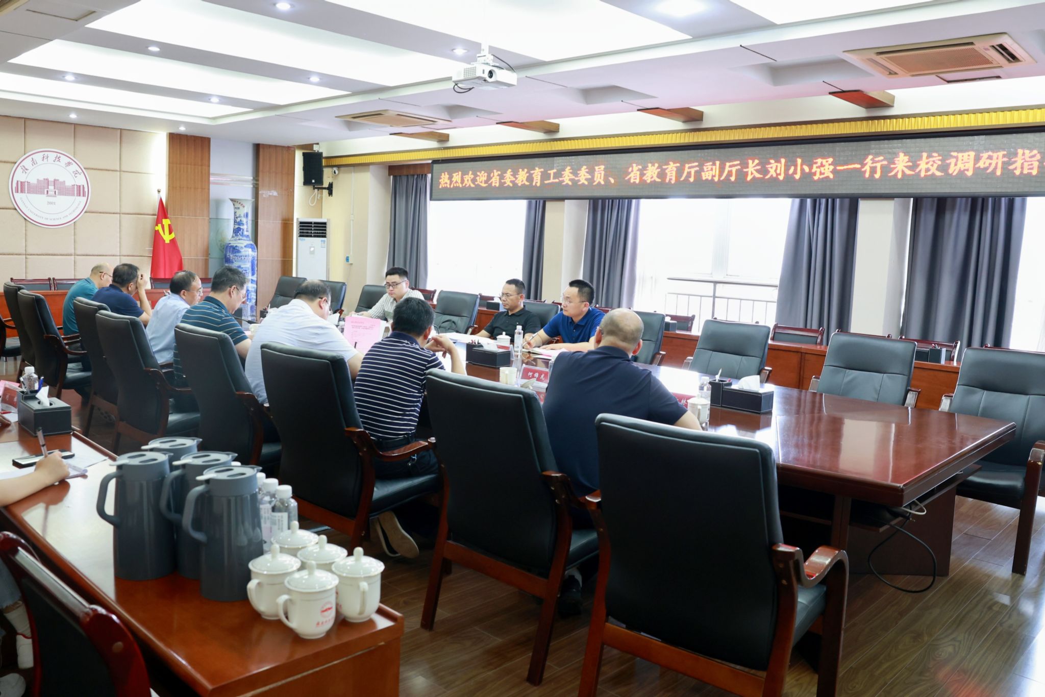 邱建军对刘小强一行的到来表示热烈欢迎,向省教育厅长期以来对我校发展的关心与支持表示感谢。李国金详细介绍了我校的办学历史、目标定位、发展愿景、运行情况及下一步工作打算,并希望省委教育工委、省教育厅对我校合格评估教学成果、硕士学位授权点建设、实验室及学生宿舍等基础设施建设,给予更多的指导、支持和帮助。