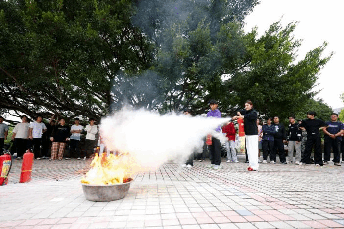 消防指战员现场演示灭火器“提、拔、握、压”操作流程与防烟面罩佩戴方法,组织学生代表分组实操练习,针对演练中发现的细节问题进行专业点评,明确宿舍用电安全、楼道杂物清理等注意事项,让“隐患险于明火”的安全意识深植人心。