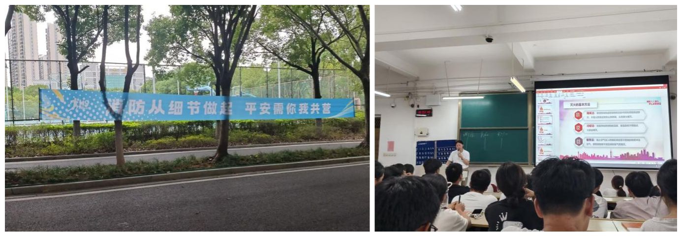 为让消防安全理念渗透到校园每个角落,学校多渠道、全方位开展宣传预热。校园主干道、宿舍区、教学楼等地悬挂“消防从细节做起平安需你我共营”“全民消防生命至上安全用火用电”等主题横幅十余条;各学院以班级为单位召开消防主题班会,班主任通过典型火灾案例分析、安全知识讲解、互动问答等形式,普及宿舍用电安全、初期火灾处置等常识,构建起“视觉覆盖+互动宣讲”的立体化宣传网络,营造出“人人学消防、懂消防、守消防”的浓厚氛围。