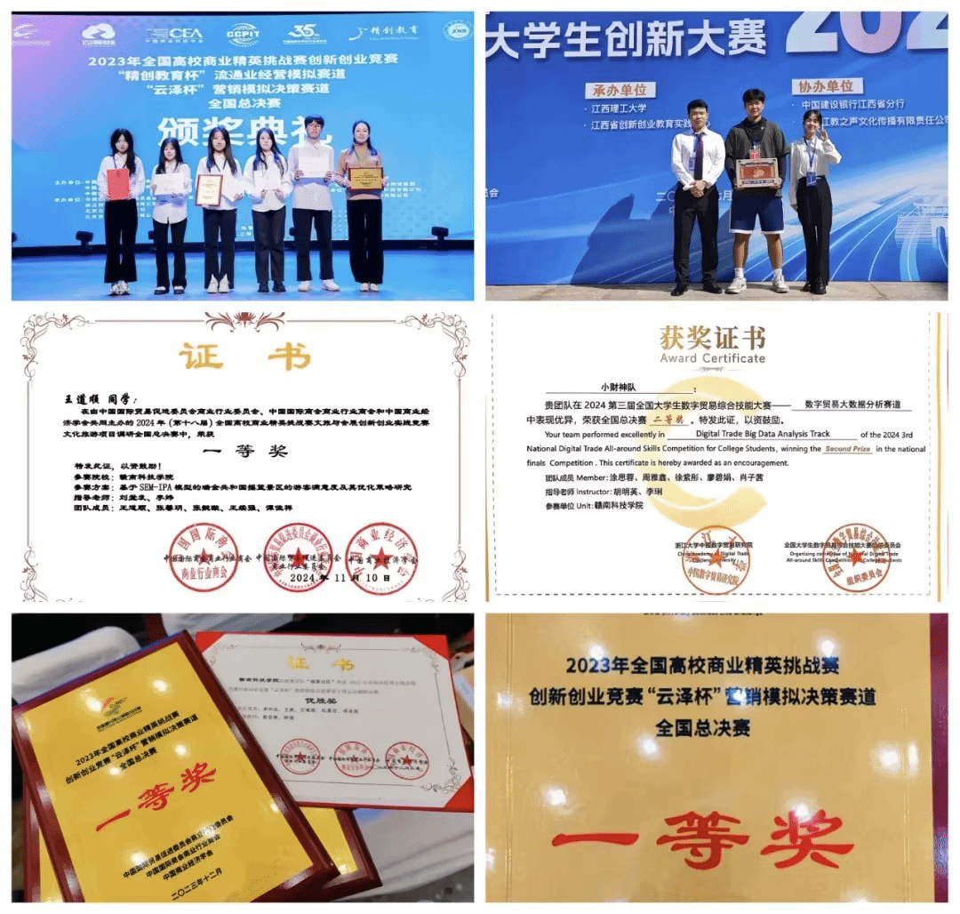 在教学方面,学院积极推动教学改革,成效显著。学院以服务国家战略和江西现代化产业发展需求为主线,开展学科专业动态调整,新增数字经济专业,并于2024年9月顺利招生。近四年,学院获得国家级一等奖34项、二等奖94项、三等奖78项,获第十九届“挑战杯”江西省大学生课外学术科技作品竞赛省赛二等奖1项,江西省大学生创新大赛(2025)省赛银奖1项,第三届江西省大学生职业规划大赛省赛铜奖1项。吴丹、胡明英2位老师在省青年教师教学竞赛中分获三等奖、优秀奖;共立项2项省级教改课题,8项校级教改课题,14项校级课程思政项目,获批教育部产学合作协同育人项目2项,新增校企合作基地1个。在本科教学工作合格评估中,学院获评“先进集体”,6人获评“先进个人”