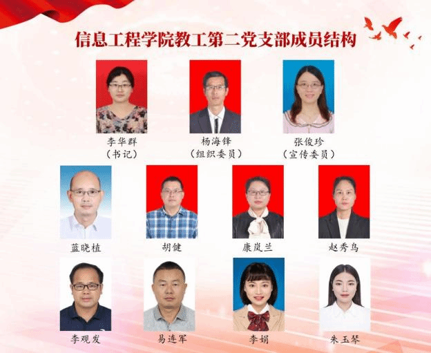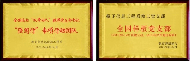 信息工程学院党委下设党支部4个,其中教工党支部2个,学生党支部2个。共有党员91人,其中教工党员44人,学生党员47人。学院教工党支部在2019年获批全国1000个党建工作样板支部,并在2022年完成验收;2021年获全省教育系统先进基层党组织。2022年党总支获批全省党建工作标杆院系,并在2025年2月完成验收。2024年教工第二党支部入选全国高校“双带头人”教师党支部书记“强国行”专项行动团队。