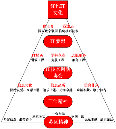 信息工程学院党委深入挖掘赣南苏区精神的深刻内涵,结合信息专业的办学特色及文化沉淀,将苏区精神进行时代化和专业化的融合,形成有丰富内涵和鲜活案例的“三信精神”(信息文化:团结友爱、互帮互助;信息品质:追求上进、力争卓越;信息作风:忠诚奉献、敢于担当)。在“三信精神”的引领下,逐步在师生中形成独特的“红色IT文化”:培养师生成为“又红又专”的IT人才,立志做“三信精神”的传承者和弘扬者,做信创产业核心技术的探索者和数字强国的建设者。学院党委精心打造“传承红色IT,筑梦卓越信息”的党建品牌,充分发挥文化育人的作用,筑牢师生的思想根基。