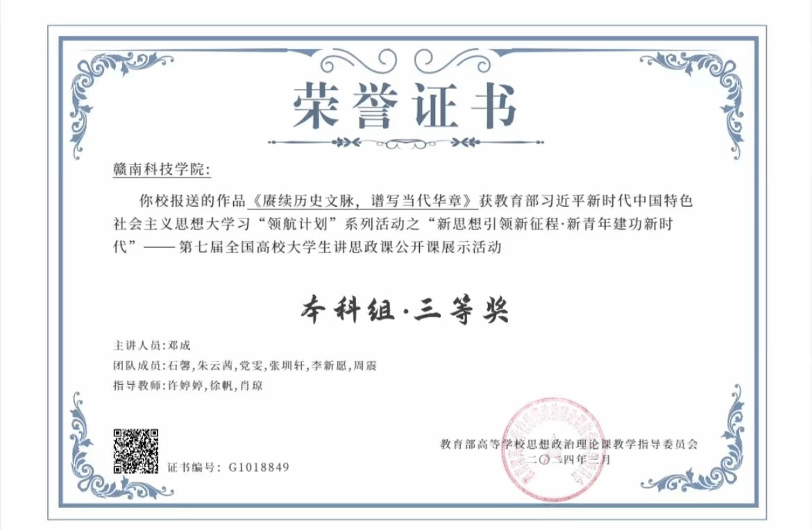 马克思主义学院现有专兼职教师37人,其中教授2人、副教授8人、博士8人,组建起一支政治强、业务精、作风正的教学科研队伍。队伍中涌现出江西省“最美思政课教师”、江西省高校思政课优秀特聘教授、江西省高校优秀思政课兼职教师、“万师润万心”心理健康讲师团讲师等一批骨干人才,1人担任国家级学会理事、9人担任省市级学会理事或基层理论宣传宣讲师资等,在教学科研与社会服务中彰显担当。教师团队严守“六要”标准,在各级各类教学竞赛中屡获佳绩,先后斩获教育部荣誉2项、省级荣誉16项、市级荣誉6项,用过硬教学能力诠释思政课教师的使命担当。