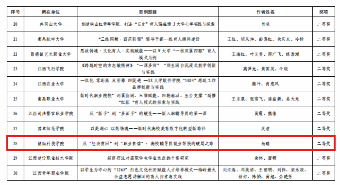 本网讯:近日,江西省教育厅公布《关于2025年度全省高校思想政治工作优秀论文和优秀案例征集活动结果的公示》,经学校推荐、专家评审,我校李东、吴玉、王鑫楠、王奕婷撰写的《大数据与数字孪生驱动的高校服务育人路径探索》获优秀论文一等奖;邱斌、夏荣涛撰写的《大中小学思政课一体化:问题审视与路径探索》获优秀论文二等奖;李晓敏、王莹蓥、魏彩军撰写的《价值、困境、对策:习近平青年观视域下高校青年马克思主义者培养的三维探赜》获优秀论文三等奖;杨瑞撰写的《从“经济贫困”到“职业自信”:高校辅导员就业帮扶的破局之路》获优秀工作案例二等奖,充分展现了我校教师扎实的科学素养和深厚的理论积淀。