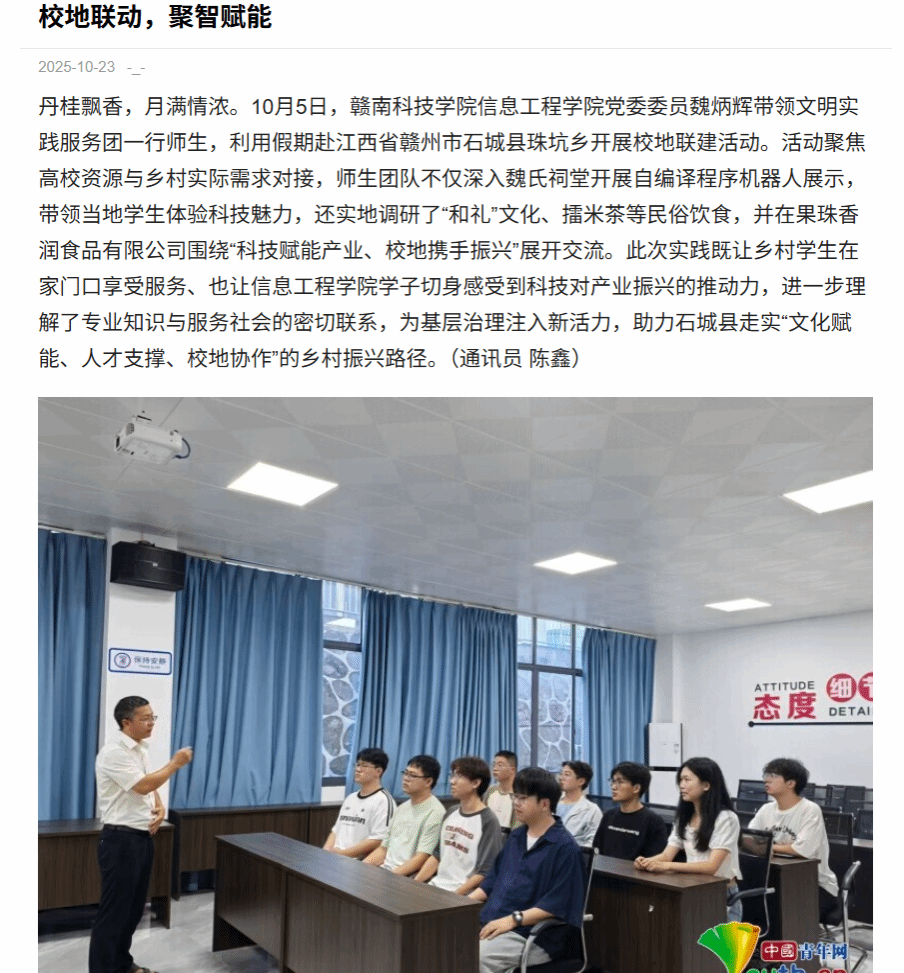 丹桂飘香,月满情浓。10月5日,亚洲欧美日韩中文字幕在线信息工程学院党委委员魏炳辉带领文明实践服务团一行师生,利用假期赴江西省赣州市石城县珠坑乡开展校地联建活动。活动聚焦高校资源与乡村实际需求对接,师生团队不仅深入魏氏祠堂开展自编译程序机器人展示,带领当地学生体验科技魅力,还实地调研了“和礼”文化、擂米茶等民俗饮食,并在果珠香润食品有限公司围绕“科技赋能产业、校地携手振兴”展开交流。此次实践既让乡村学生在家门口享受服务、也让信息工程学院学子切身感受到科技对产业振兴的推动力,进一步理解了专业知识与服务社会的密切联系,为基层治理注入新活力,助力石城县走实“文化赋能、人才支撑、校地协作”的乡村振兴路径。(通讯员 陈鑫)