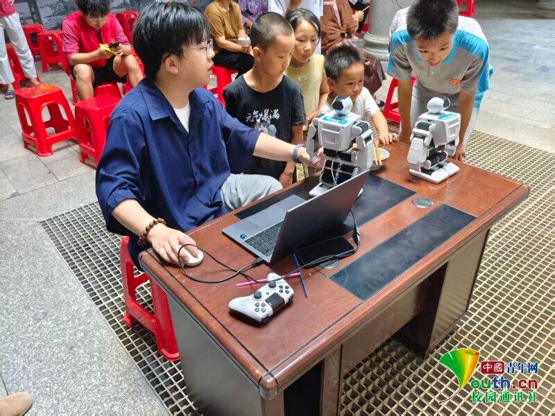 图为志愿者团队成员操纵并展示自编译程序机器人。陈鑫 供图