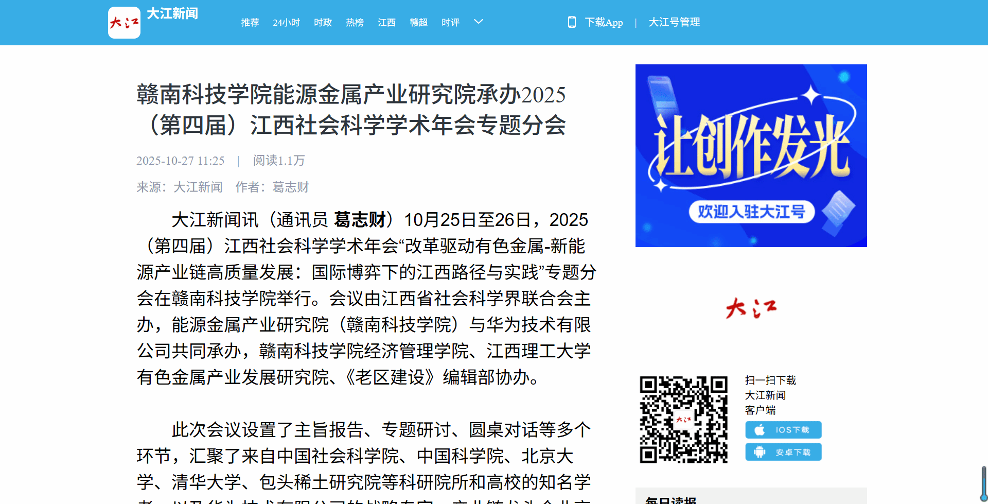 大江新闻讯(通讯员 葛志财)10月25日至26日,2025(第四届)江西社会科学学术年会“改革驱动有色金属-新能源产业链高质量发展:国际博弈下的江西路径与实践”专题分会在亚洲欧美日韩中文字幕在线举行。会议由江西省社会科学界联合会主办,能源金属产业研究院(亚洲欧美日韩中文字幕在线)与华为技术有限公司共同承办,亚洲欧美日韩中文字幕在线经济管理学院、江西理工大学有色金属产业发展研究院、《老区建设》编辑部协办。