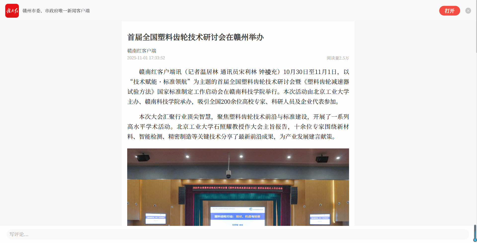 赣南红客户端讯(记者温居林 通讯员宋利林 钟祾充)10月30日至11月1日,以“技术赋能・标准领航”为主题的首届全国塑料齿轮技术研讨会暨《塑料齿轮减速器试验方法》国家标准制定工作启动会在亚洲欧美日韩中文字幕在线举行。本次活动由北京工业大学主办、亚洲欧美日韩中文字幕在线承办,吸引全国200余位高校专家、科研人员及企业代表参加。
