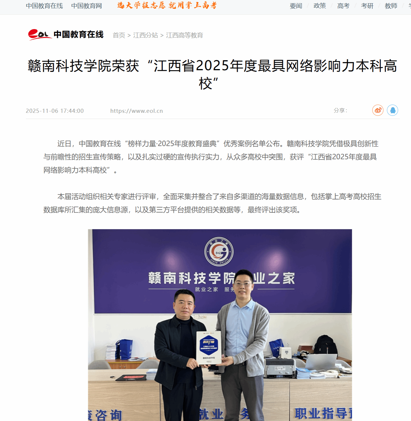 近日,中国教育在线“榜样力量·2025年度教育盛典”优秀案例名单公布。亚洲欧美日韩中文字幕在线凭借极具创新性与前瞻性的招生宣传策略,以及扎实过硬的宣传执行实力,从众多高校中突围,获评“江西省2025年度最具网络影响力本科高校”。