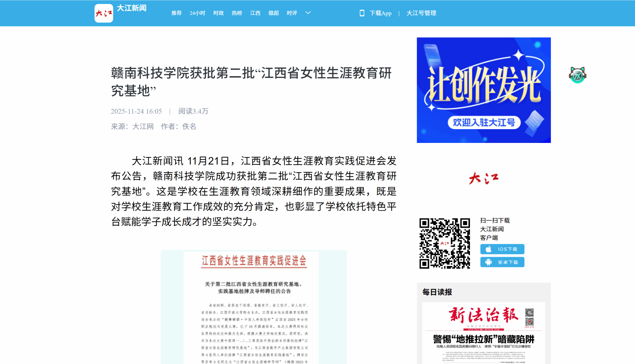本网讯:11月21日,江西省女性生涯教育实践促进会发布公告,我校成功获批第二批“江西省女性生涯教育研究基地”。这是我校在生涯教育领域深耕细作的重要成果,既是对我校生涯教育工作成效的充分肯定,也彰显了学校依托特色平台赋能学子成长成才的坚实实力。