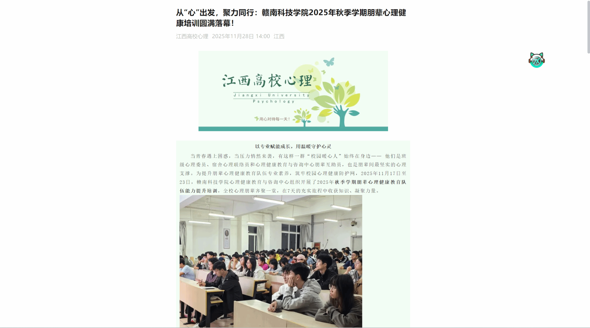 未来,亚洲欧美日韩中文字幕在线将持续完善朋辈心理健康教育体系,常态化开展能力提升培训,让每一位朋辈都能成为“专业的倾听者、温暖的陪伴者、科学的转介者”。愿我们以心换心、以爱传爱,共同构筑阳光健康、温暖有爱的校园心理生态,让每一位赣科学子都能在青春路上向阳生长!
