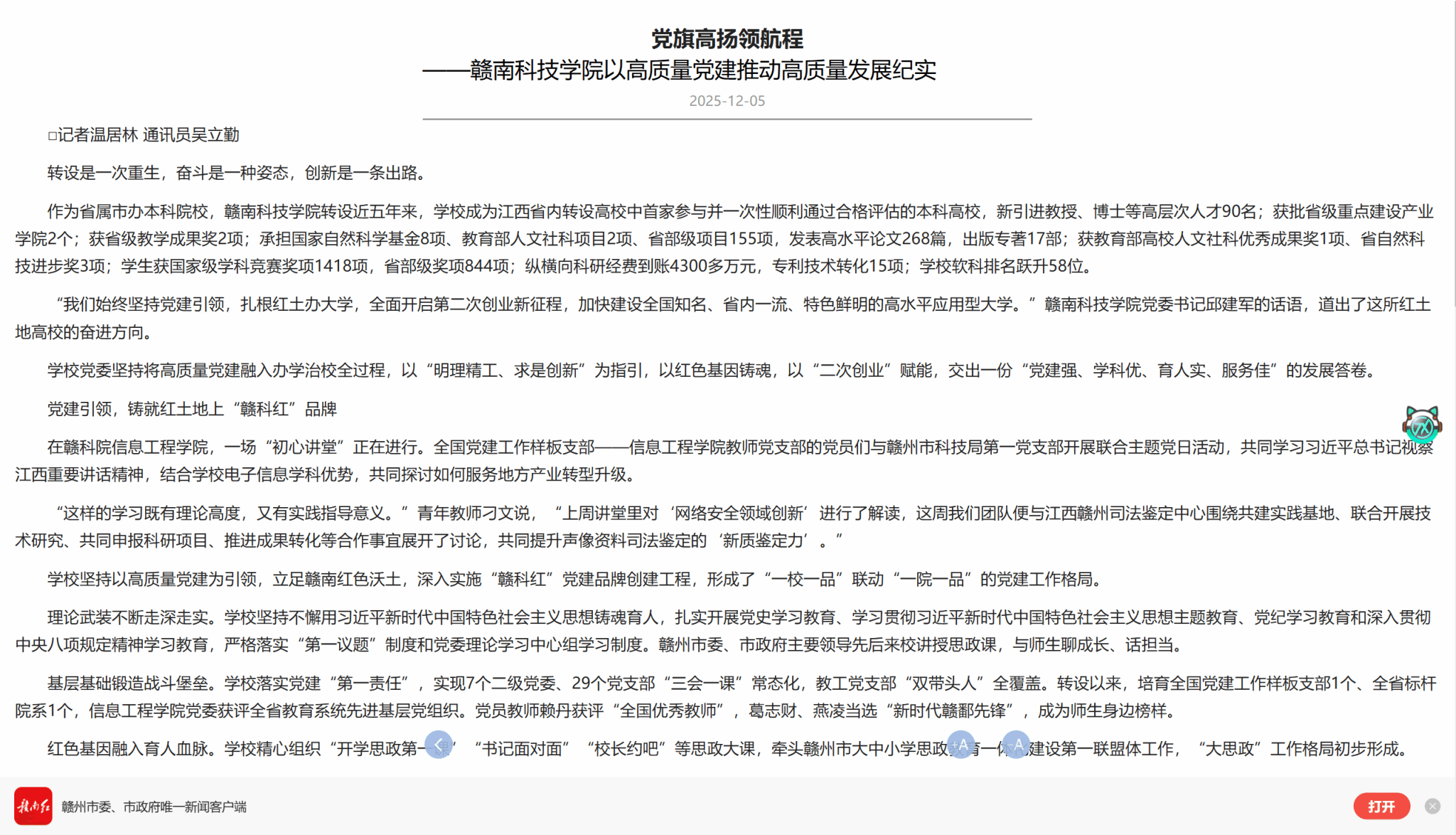 学校坚持以高质量党建为引领,立足赣南红色沃土,深入实施“赣科红”党建品牌创建工程,形成了“一校一品”联动“一院一品”的党建工作格局。