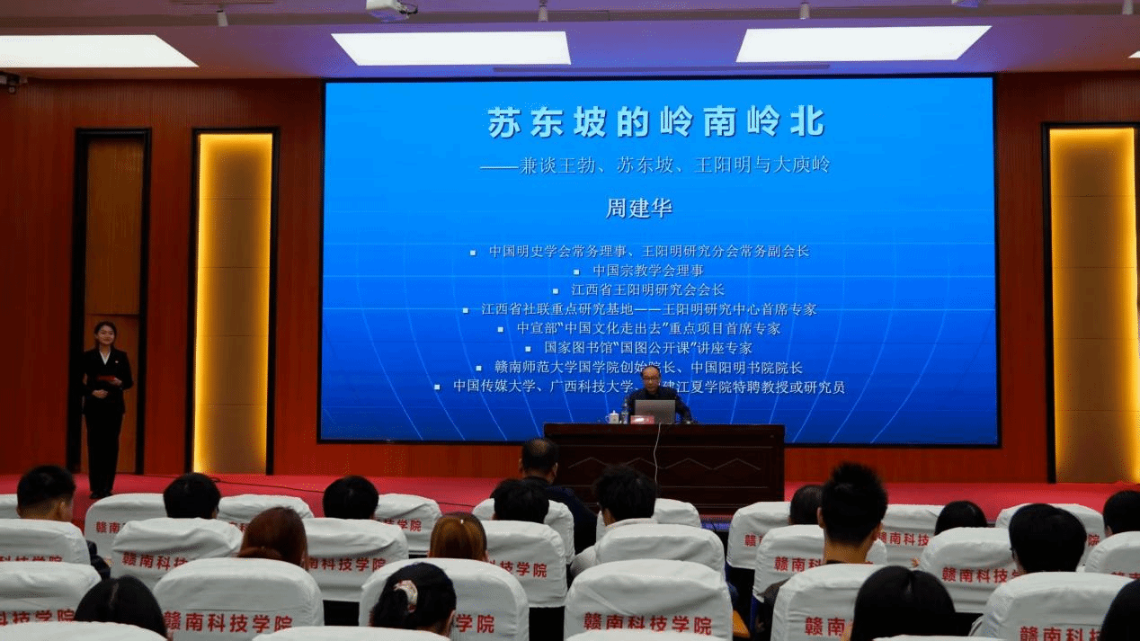 本网讯:10月27日晚,我校第102期“金沙湾”讲坛在图书馆学术报告厅举行。本次讲坛特邀中国明史学会常务理事、王阳明研究分会常务副会长周建华教授作《苏东坡的岭南岭北》专题讲座。现场300余名学子齐聚一堂,共赴这场跨越时空的文化之约。