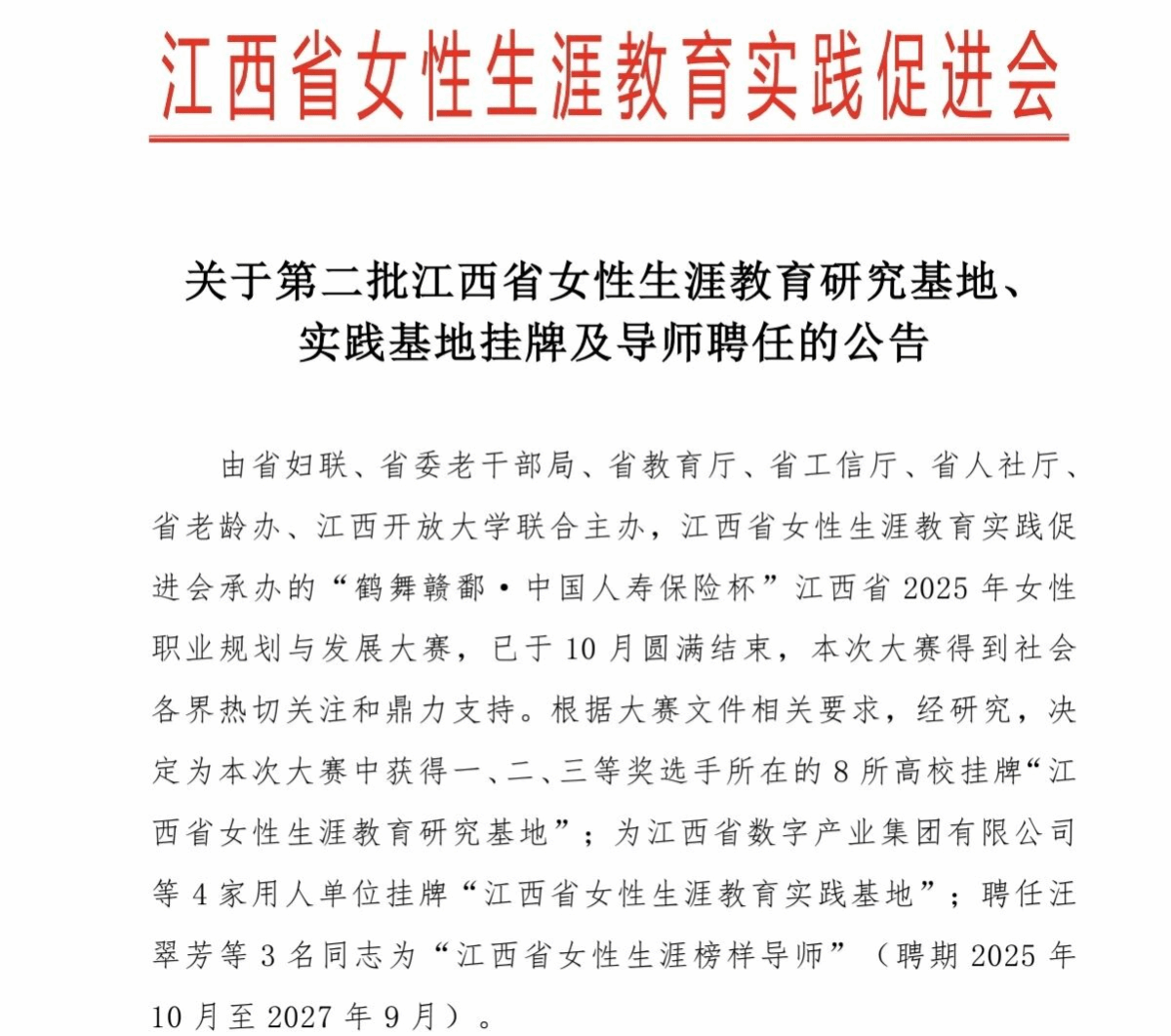 本网讯:11月21日,江西省女性生涯教育实践促进会发布公告,我校成功获批第二批“江西省女性生涯教育研究基地”。这是我校在生涯教育领域深耕细作的重要成果,既是对我校生涯教育工作成效的充分肯定,也彰显了学校依托特色平台赋能学子成长成才的坚实实力。