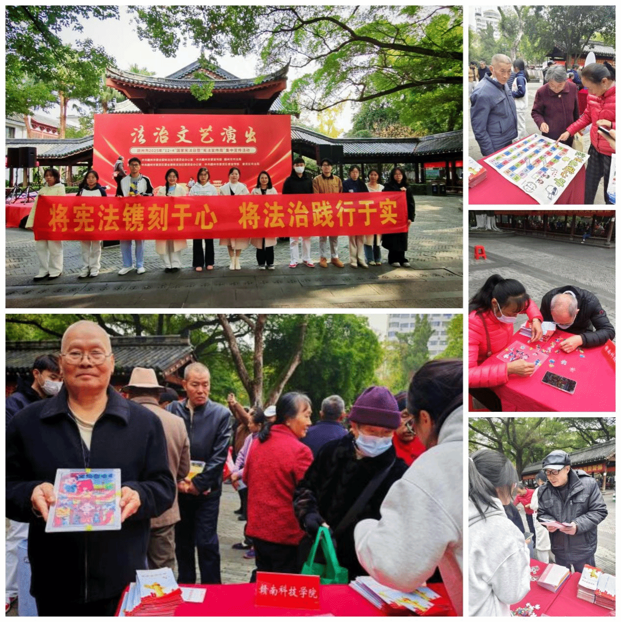 在校外联动方面,12月4日上午,普法社师生代表应赣州市司法局邀请,参与赣州市2025年“12・4”国家宪法日集中宣传活动。在赣州公园活动现场,师生们通过布置展位、组织互动游戏、分发宣传手册、提供简易法律咨询等方式,向市民普及宪法及法律常识,将法治课堂延伸至社区,展现了我校学子传播法治文化、服务社会的责任担当。