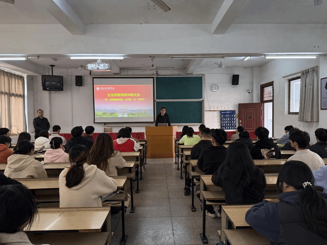 本网讯:2026年全国硕士研究生考试临近,为进一步鼓舞学子士气、舒缓备考压力,12月9日,文法学院于第一教学楼303教室举办考研冲刺大会。学院领导班子、毕业班班主任及百余名考研学子齐聚一堂,共同吹响决胜考研的“冲锋号”。
