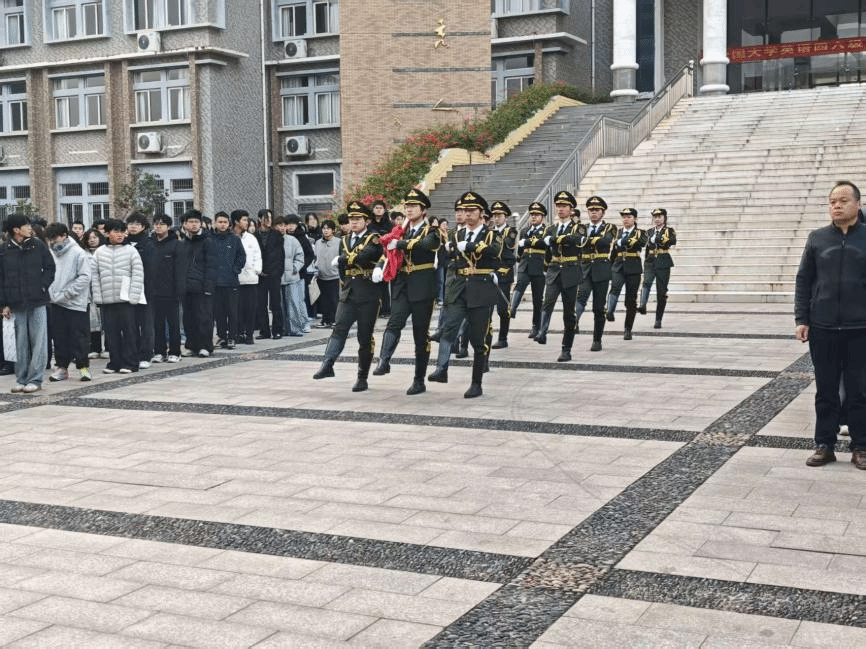 仪式伊始,国旗护卫队步伐铿锵,庄严护送国旗至升旗台。伴随《义勇军进行曲》雄壮旋律,五星红旗冉冉升起,迎风飘扬。全体师生肃立注目,齐声高唱国歌,激昂的歌声与真挚的爱国热情交融,汇聚成清晨最动人的回响。