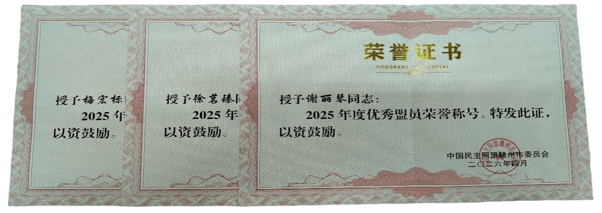 本网讯:4月14日,民盟赣州市委会六届二次全委(扩大)会议在市政协会议室召开。会议对2025年度表现突出的先进集体和先进个人予以表彰。其中,我校盟员梅宏标、徐茗臻、谢丽琴三位同志荣获赣州市“优秀盟员”称号。