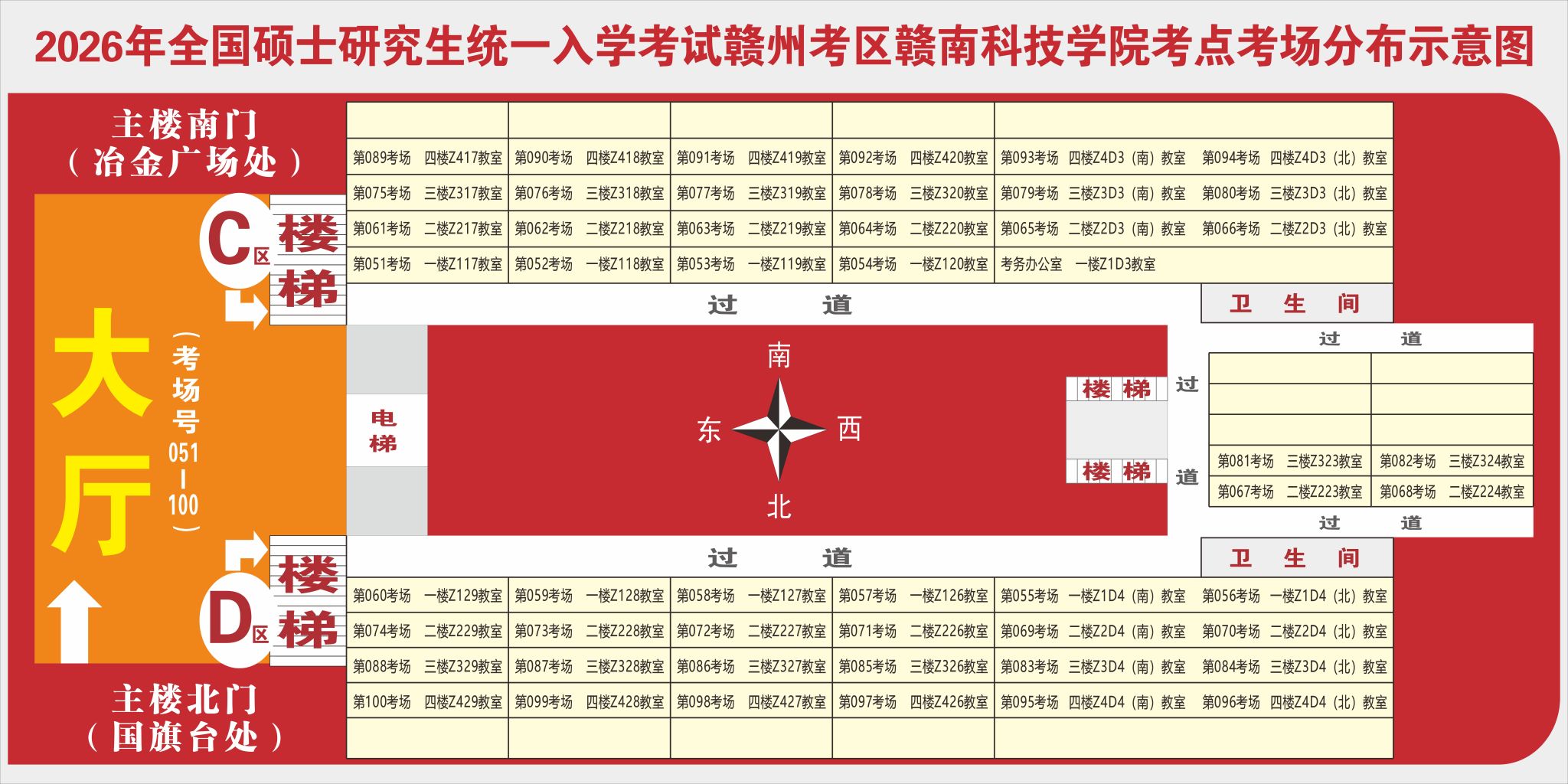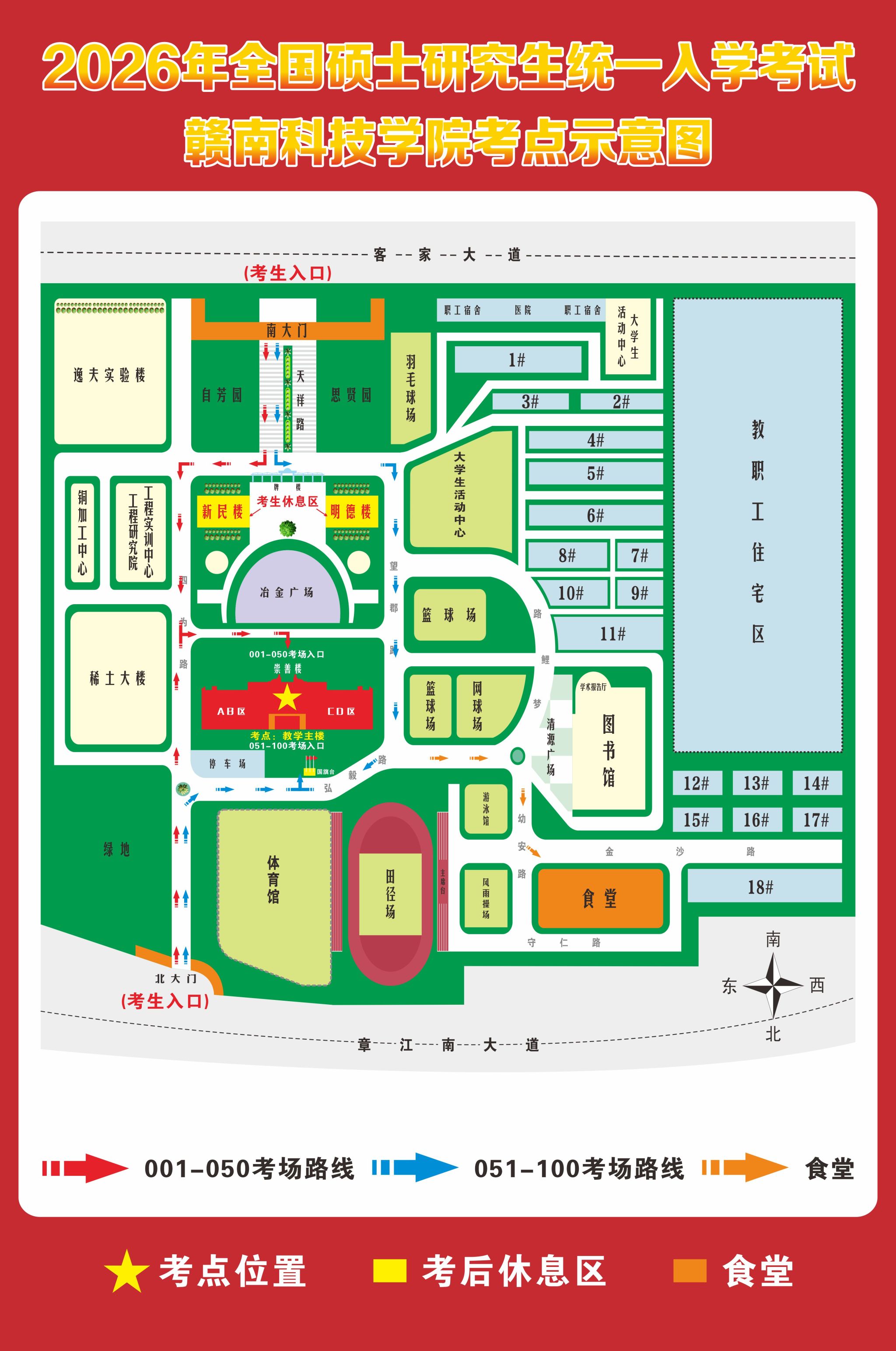 1.我校考点位于赣州市章贡区客家大道156号,考场位置在教学主楼。考生可于12月19日下午16:30-17:30,凭准考证、身份证入校熟悉考点环境和考场分布,但不可进入考场!