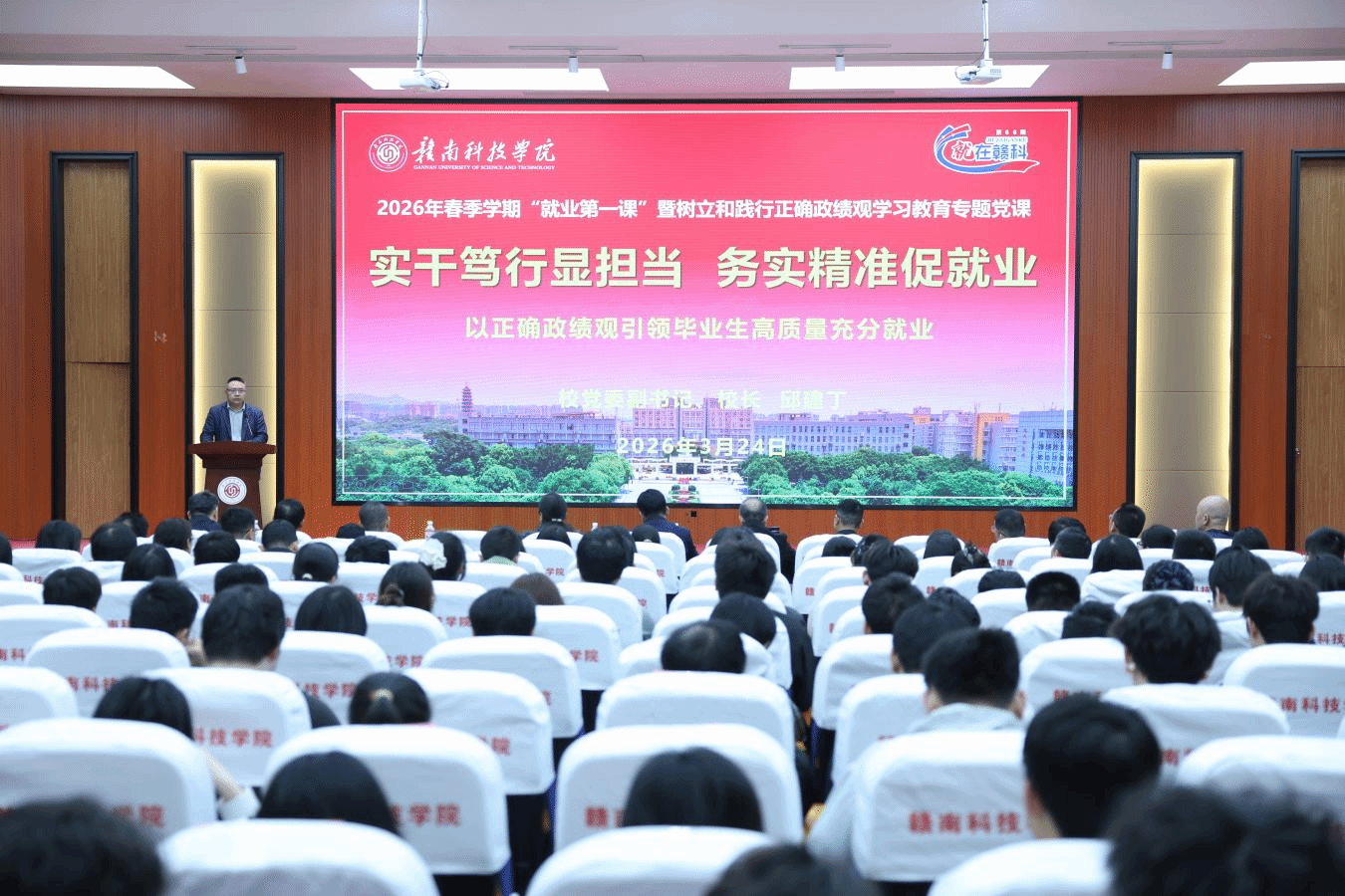 本网讯:3月24日下午,校党委副书记、校长邱建丁以“实干笃行显担当 务实精准促就业——以正确政绩观引领毕业生高质量充分就业”为主题,在图书馆学术报告厅为广大师生讲授2026年春季学期“就业第一课”暨树立和践行正确政绩观学习教育专题党课,深入学习贯彻党中央、国务院关于高校毕业生就业创业工作的决策部署,扎实开展树立和践行正确政绩观学习教育,严格落实就业工作“一把手工程”,引导毕业生树立正确就业观、成才观、职业观,全力推动 2026届毕业生高质量充分就业。各学院主要领导,就业工作分管领导,毕业班辅导员、班主任及毕业生代表共计300余人到场聆听。本次党课由招生就业处处长杨智勇主持。