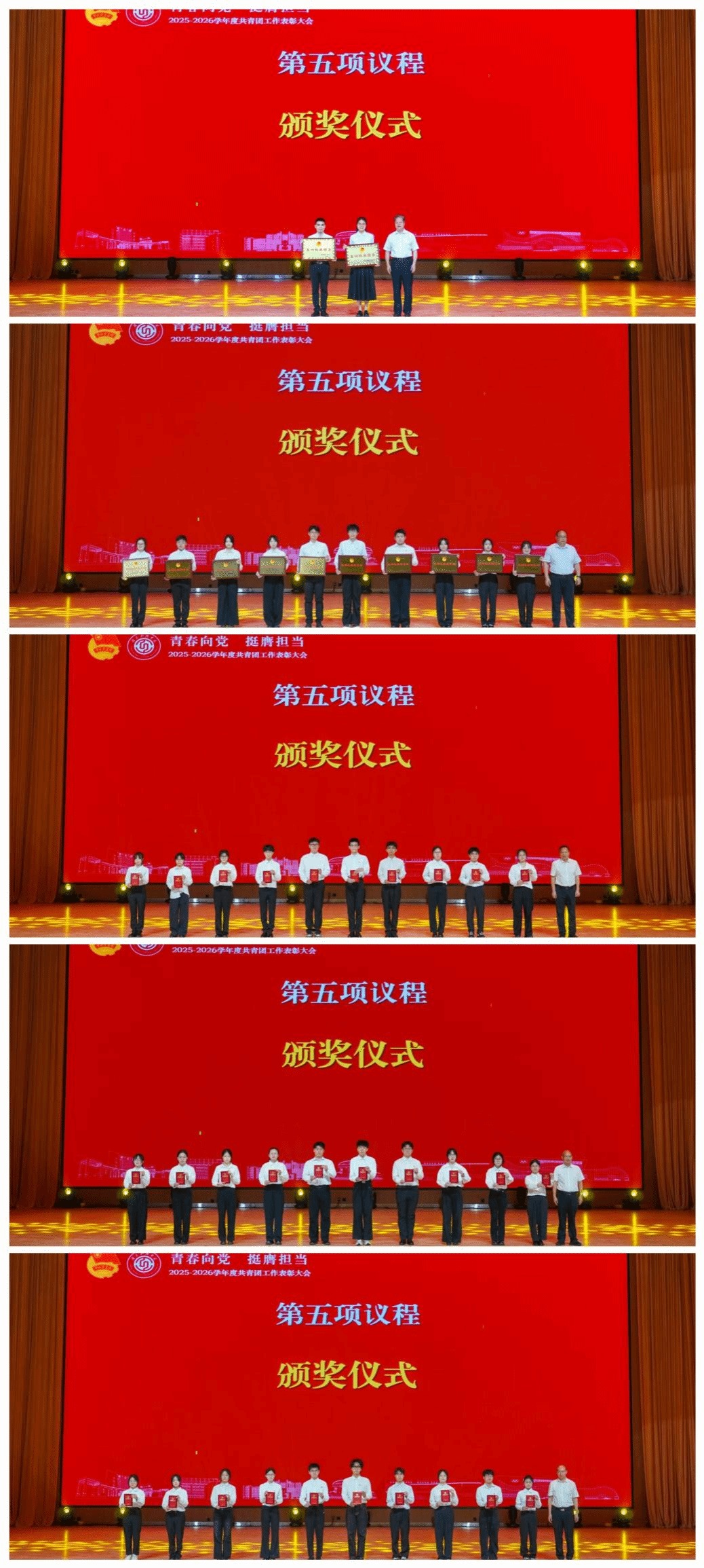 学校领导班子成员分别为受表彰的先进集体和个人颁发奖牌、证书。其中,经济管理学院团委、资源与土木工程学院团委荣获“五四红旗团委”称号;英语232班团支部等27个团支部荣获“五四红旗团支部”称号;工商232班马莹娜等26名同学荣获“优秀团员标兵”称号;智造241班周文豪等111名同学荣获“优秀团干部”称号;物联网241班周士杰等184名同学荣获“优秀团员”称号。