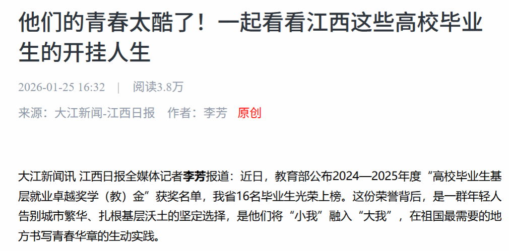 大江新闻讯 江西日报全媒体记者李芳报道:近日,教育部公布2024—2025年度“高校毕业生基层就业卓越奖学(教)金”获奖名单,我省16名毕业生光荣上榜。这份荣誉背后,是一群年轻人告别城市繁华、扎根基层沃土的坚定选择,是他们将“小我”融入“大我”,在祖国最需要的地方书写青春华章的生动实践。