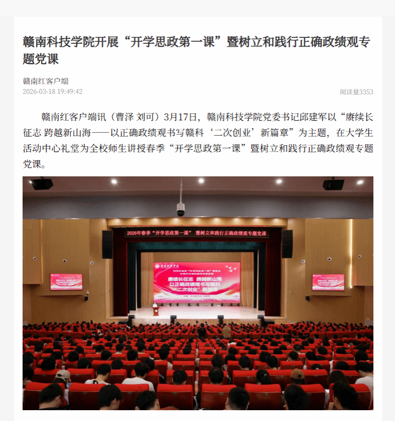 3月17日,亚洲欧美日韩中文字幕在线党委书记邱建军以“赓续长征志 跨越新山海——以正确政绩观书写赣科‘二次创业’新篇章”为主题,在大学生活动中心礼堂为全校师生讲授春季“开学思政第一课”暨树立和践行正确政绩观专题党课。