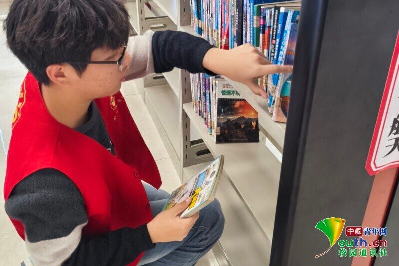 图为吴宇飞同学前往家乡崇义县图书馆整理书籍。吴宇飞 供图