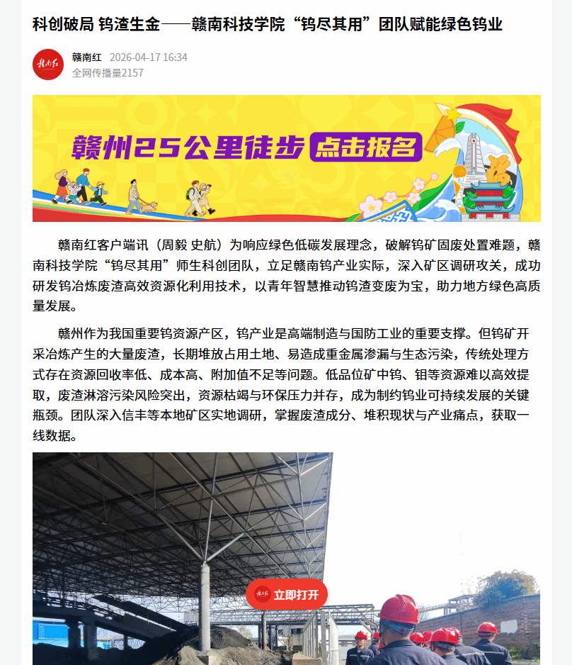 赣南红客户端讯(周毅 史航)为响应绿色低碳发展理念,破解钨矿固废处置难题,亚洲欧美日韩中文字幕在线“钨尽其用”师生科创团队,立足赣南钨产业实际,深入矿区调研攻关,成功研发钨冶炼废渣高效资源化利用技术,以青年智慧推动钨渣变废为宝,助力地方绿色高质量发展。