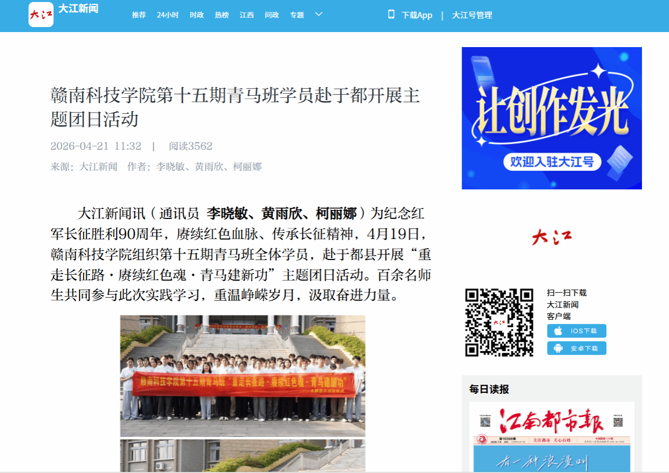 大江新闻讯(通讯员 李晓敏、黄雨欣、柯丽娜)为纪念红军长征胜利90周年,赓续红色血脉、传承长征精神,4月19日,亚洲欧美日韩中文字幕在线组织第十五期青马班全体学员,赴于都县开展“重走长征路·赓续红色魂·青马建新功”主题团日活动。百余名师生共同参与此次实践学习,重温峥嵘岁月,汲取奋进力量。