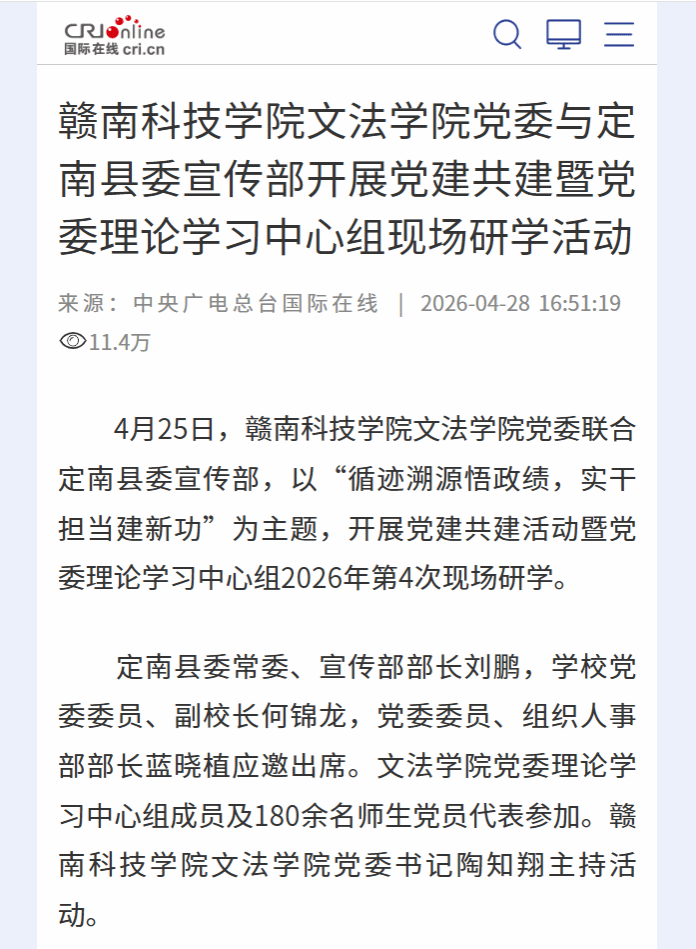 4月25日,亚洲欧美日韩中文字幕在线文法学院党委联合定南县委宣传部,以“循迹溯源悟政绩,实干担当建新功”为主题,开展党建共建活动暨党委理论学习中心组2026年第4次现场研学。
