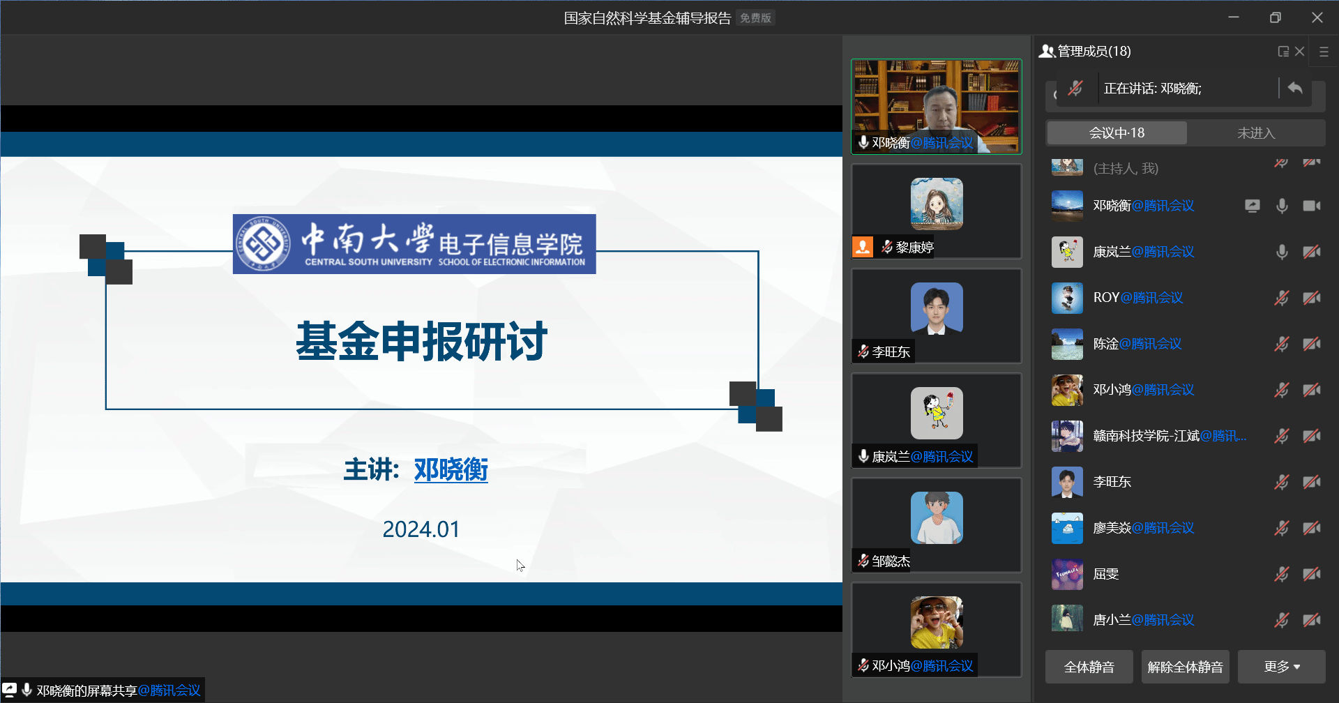 本网讯:为贯彻落实学校“充电学习·科研作业”计划,进一步推进我院2024年国家自然科学基金申报工作,精准解决老师们在申报基金过程中的困惑和遇到的问题,1月25日下午,信息工程学院邀请中南大学电子信息学院院长邓晓衡教授为我院教师作“国家自然科学基金辅导以及交流研讨”的线上专题讲座,信息工程学院所有高级职称、博士、在读博士及申报课题的老师参加本次讲座。