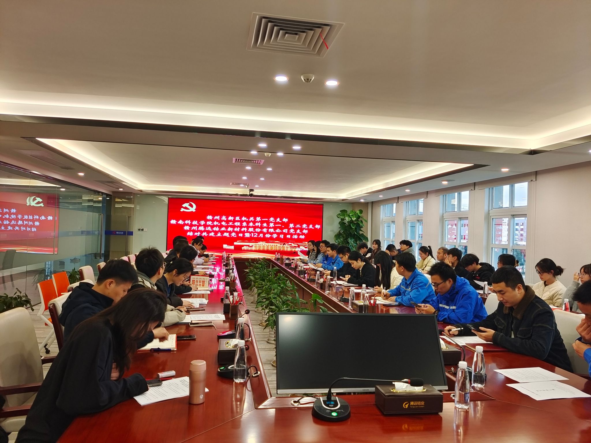 本网讯:为深入学习贯彻党的二十大精神,进一步深化政校企合作,推进政校企党建工作融合共进,依托区域特色,提升应用创新性人才培养质量。12月12日下午,机电工程系本科生第一、第二党支部与赣州高新区机关第一党支部、赣州腾远钴业新材料股份有限公司党支部在赣州腾远钴业新材料股份有限公司党员活动室开展结对共建主题党日活动。会议由赣州高新区机关第一党支部书记黄玮主持。来自三家单位的党员代表共50余人参会。
