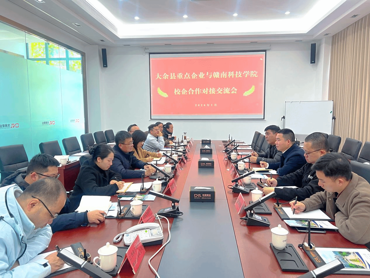参观结束后,在江西东腾锂业有限公司会议室开展了校企合作对接交流会,江西东腾锂业有限公司、江西悦安新材料股份有限公司、江西希尔曼新能源科技有限公司、大余县章江供水有限责任公司、中国电信股份有限公司大余分公司等重点企业代表参加了座谈交流。会上,江志林系统介绍了大余县工业发展概况。他指出,当前大余正着力明确以钨及有色金属新材料为园区主导产业,大力推动传统产业转型升级,积极培育县域经济发展新动能,并希望能在人才供给、科研创新等方面获得学校的支持。招生就业处负责人杨智勇就学校建校历程、办学特色及师资队伍建设等方面作了详细介绍,并表达了与地方政府和企业加强合作的积极意愿。随后,与会政府部门其他代表、企业负责人及学院教师围绕行业发展趋势、企业人才需求、产教融合协同机制等议题展开深入交流。