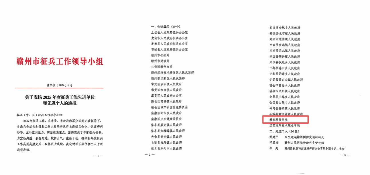 本网讯:近日,赣州市征兵工作领导小组公布了《关于表扬2025年度征兵工作先进单位和先进个人的通报》,我校荣获赣州市2025年度征兵工作先进单位称号。