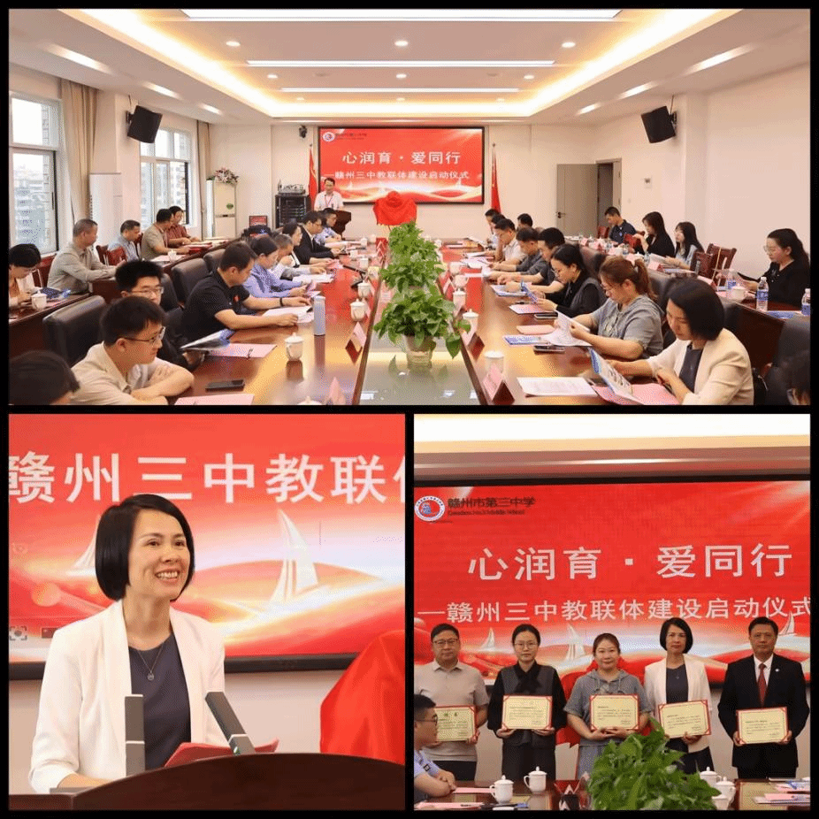 本网讯:4月16日下午,赣州市第三中学“心润育・爱同行”“爱育”教联体启动仪式在该校青年路校区举行。我校与赣南师范大学、赣南医科大学第一附属医院、赣州市教育局、赣州市人民检察院、赣州市体育局、赣州市教育教学科学研究所等20余家单位作为合作共建单位受邀出席并获颁聘书。