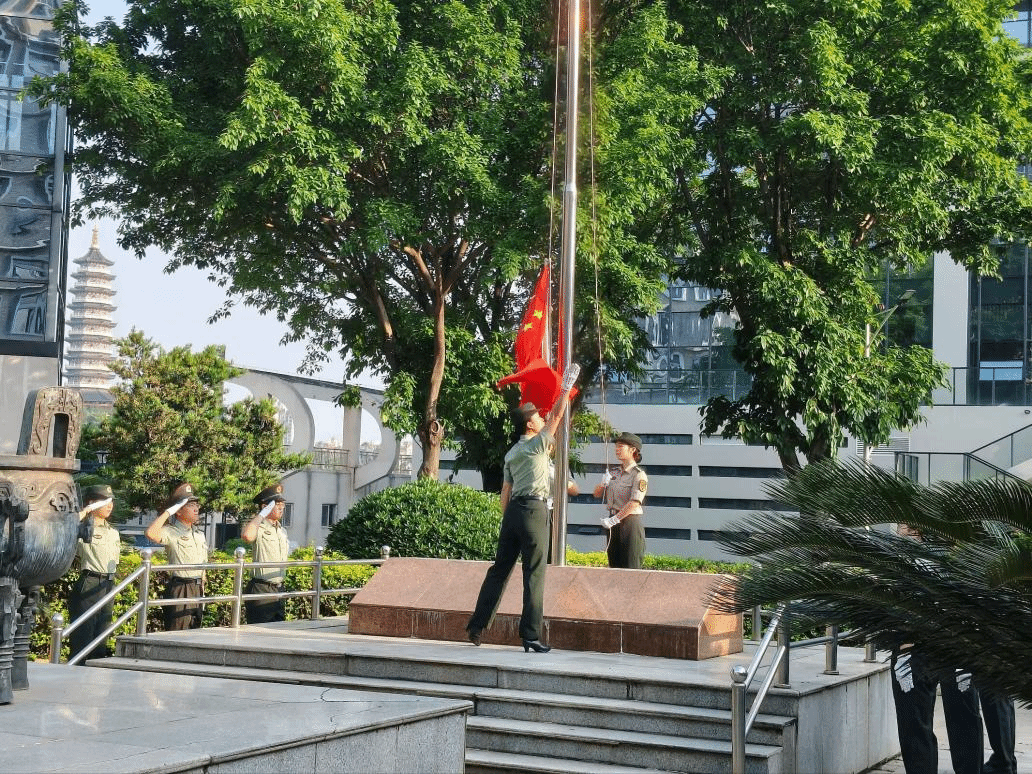 晨光熹微,仪式正式开始。国旗护卫队步伐铿锵、精神抖擞,护送五星红旗走向升旗台。伴随着雄壮激昂的《义勇军进行曲》,鲜艳的五星红旗冉冉升起,全体师生肃立注目、高唱国歌,现场气氛庄严肃穆。