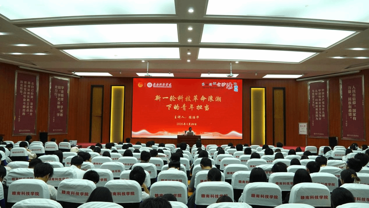 本网讯:4月24日,我校第106期“金沙湾”讲坛在图书馆学术报告厅举行。本次讲坛特邀赣州市科技局党组成员、副局长陈浩华作《新一轮科技革命浪潮下的青年担当》专题讲座。现场300余名师生齐聚一堂,拥抱科技变革的时代机遇,共话新时代青年的使命担当。