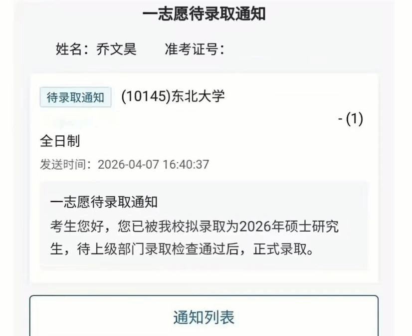 无数个日夜的坚守与付出,最终换来了梦想成真的时刻。乔文昊成功叩开了东北大学的大门,这份喜悦,是对他所有努力的最好回馈。