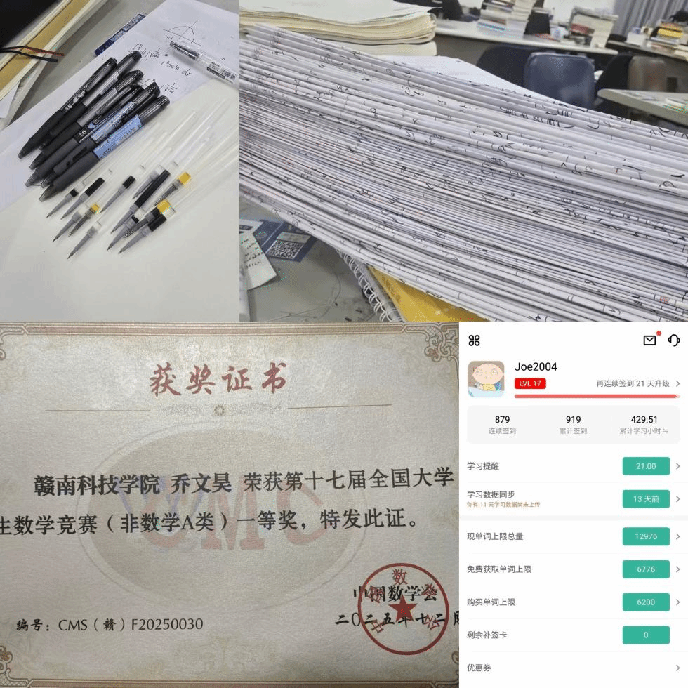 一次偶然的机会,他报名参加了全国大学生数学竞赛,把这场赛事视为自我突破的契机。他投入大量时间,通过详尽的笔记、反复的公式推演,将教材中的例题拆解为一个个基础知识点,逐行推导公式逻辑,反复钻研。凭借不懈努力,他最终荣获全国大学生数学竞赛江西省三等奖。这一奖项不仅是对他学习成果的肯定,更重塑了他的信心,让他深刻体会到,只要肯下苦功,所谓的“短板”也能转化为“长板”。